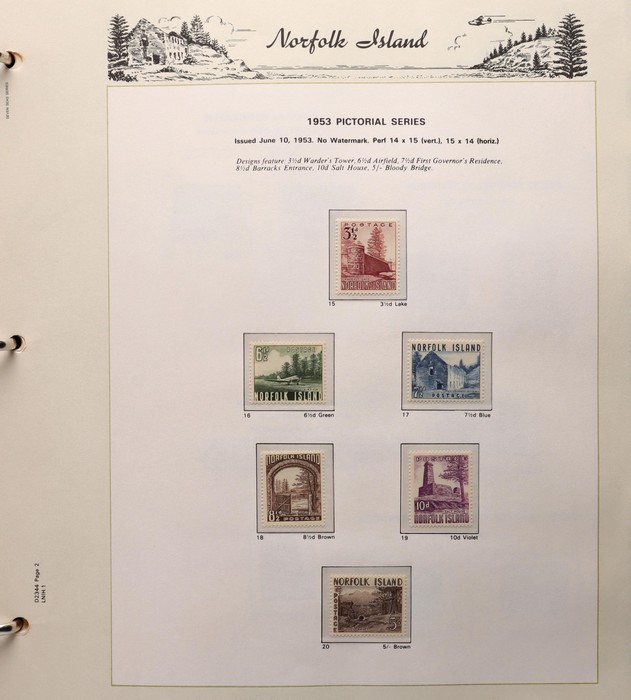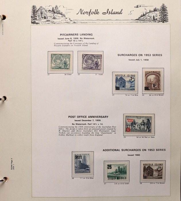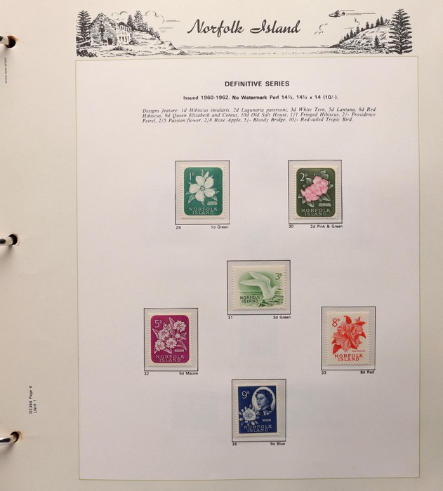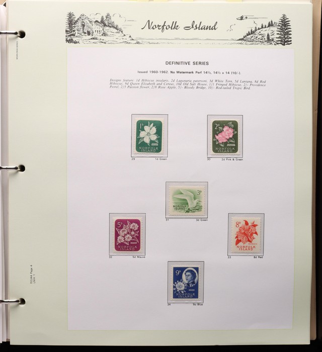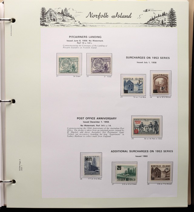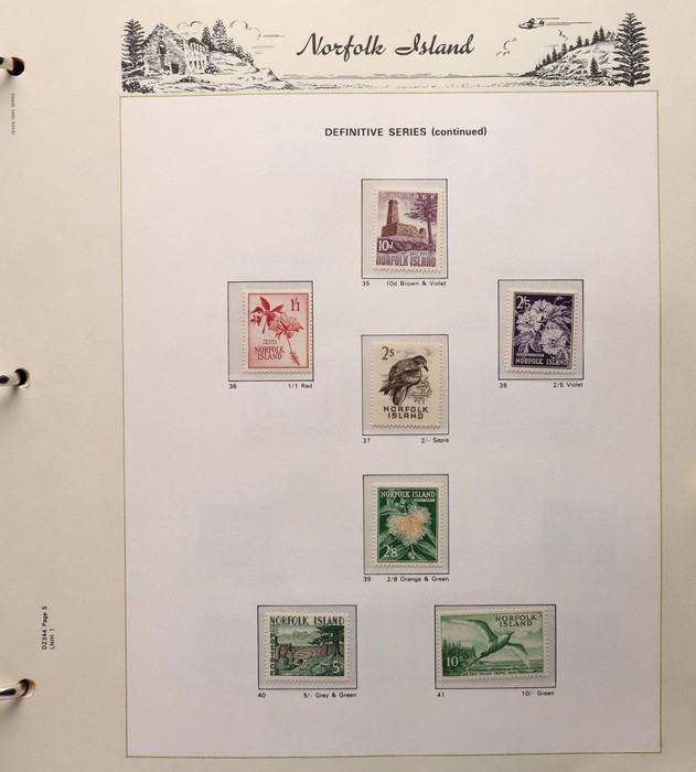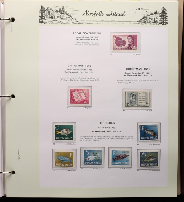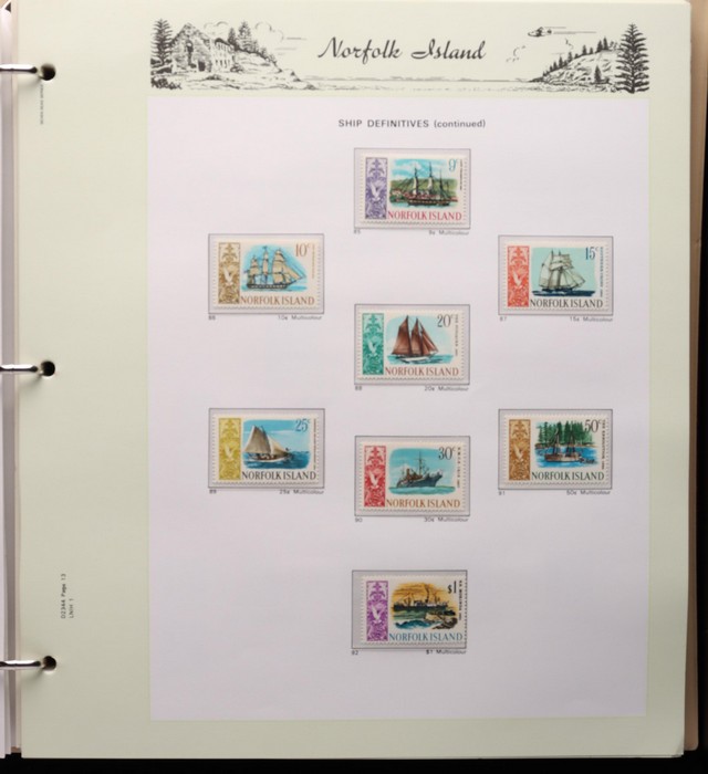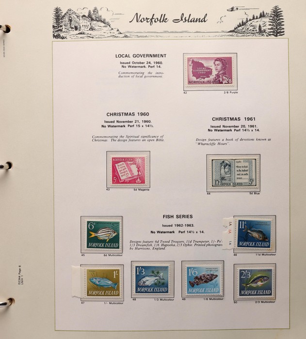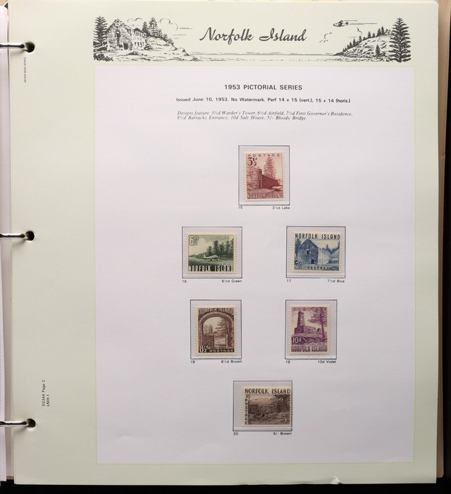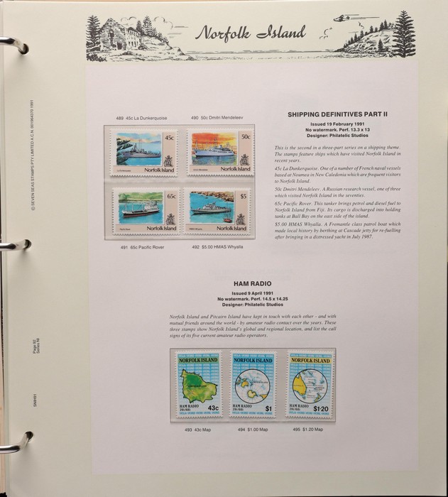 739 imageNorfolk Island: 1947-92 MNH collection in Seven Seas illustrated album with 1947 Ball Bay set to 2/- green, plus ½d, 1d, 1½d, 2d white papers. 1953 Pic set to 5/- brown Bridge. 1960 Defs to 10/- Bird, plus extra 10/- opt SPECIMEN, 1960 Local Govt 2/8, 1966 opt set, 1967 Ships, 1969 Birds, 1974 UPU M/Sheet, 1987 Scenes & Ships to $5. All F-VF MNH, retail $1000. (Image1) (Image2) (Image3) (Image4) (Image5) (Image6) (Image7) (Image8) (Image9) (Image10)