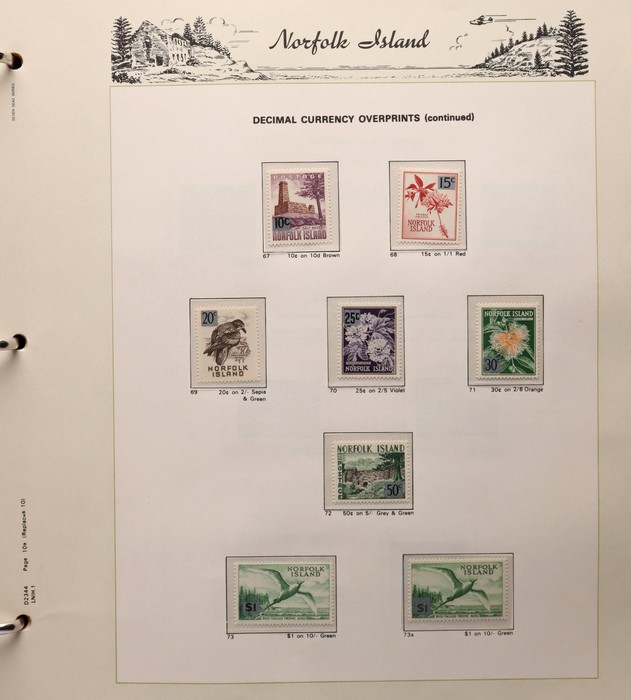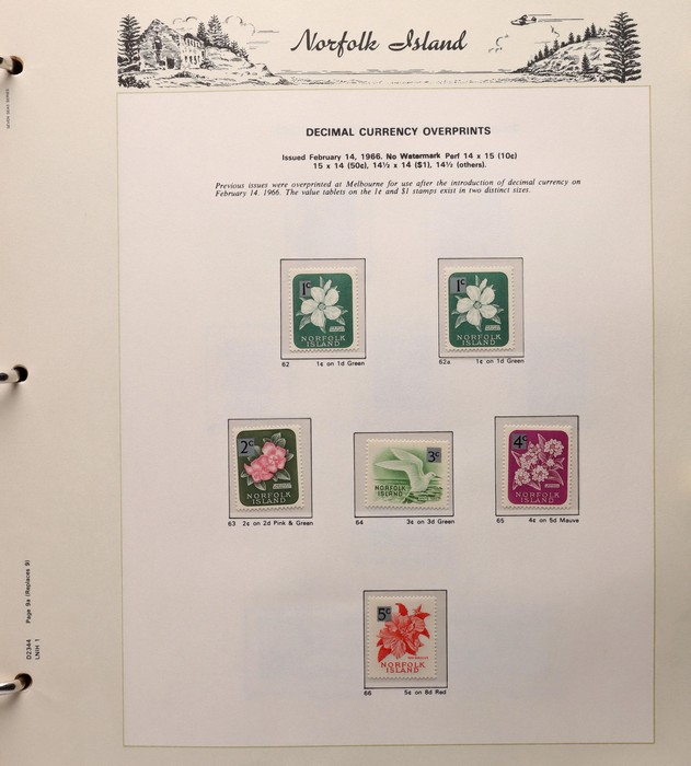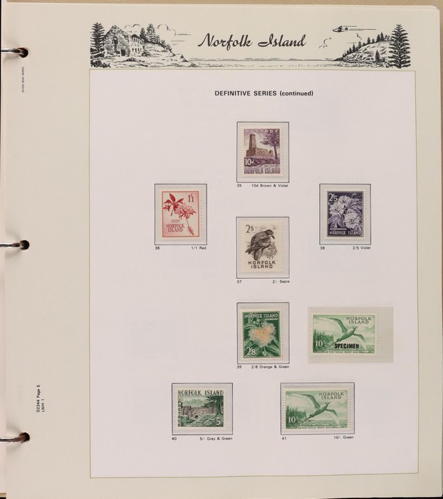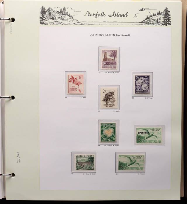 736 imageNorfolk Island collection 1947-2000 in 2 Seven Seas hingeless albums comprehensive MNH. Inc 1947 Ball Bay set of 14, 1953 Pic set, 1960 Pic set also with 10/- Bird opt 'Specimen', 1966 Surcharges set & 50 on through to 2000 (post 1980 FV alone $430), a colourful & fresh collection largely VF. Retail c$1400 plus another $300 or so for the albums. (c700+) (Image1) (Image2) (Image3)