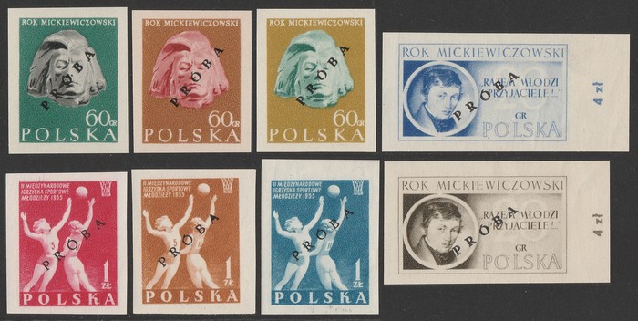 trial proofs with Anniv of Warsaw Liberation (4), Monuments (22), Russo-Polish Treaty (8), Cycle Race (7), Poznan Fair (6), International Games (13), Anniv of Return of Territories (8), Revolution 50th Anniv (6), Mickiewicz (13). All diff colours,