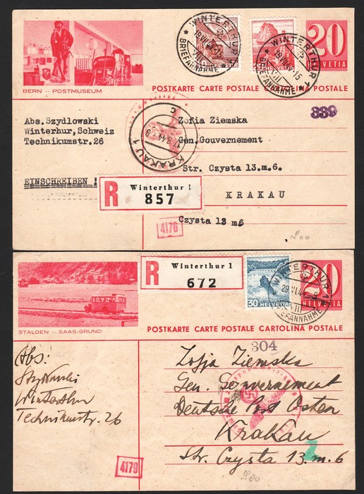 Inwards use of Switzerland Postal Cards with 1941 10c violet with sm view on front uprated 10c tied 'Winterthur 18 III 41' cds. 1944 Registered view cards (2), each uprated 30c tied Winterthur Aug 44 cds. All with censor h/s to Krakow, plus 1942