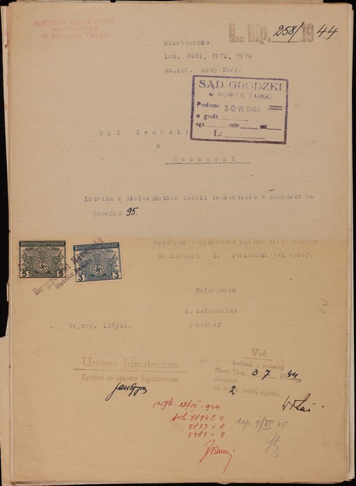 Govt: 1940-44 legal documents with various Stamp Duty & Court Fee revenues to 5zl, inc mixed frankings. Mostly F-VF. Interesting lot. (11 docs) (Image1) (Image2)