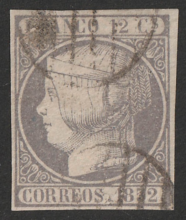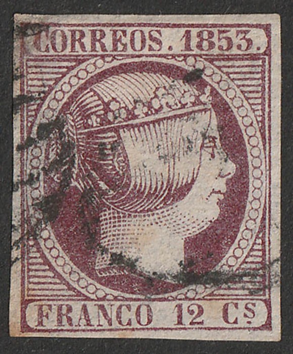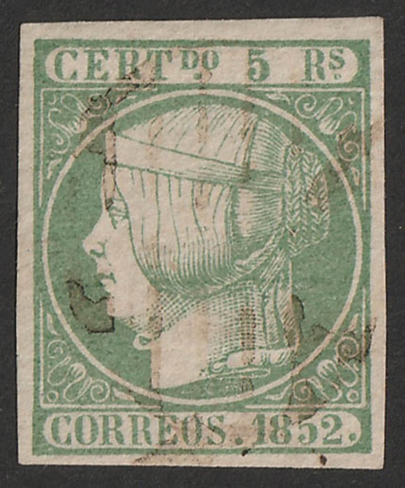 brown on brown. U, 2½ margins, cnr fault, black wagon wheel pmk. Scott 52, SG 66 cat £1700, Edifil 54a cat €2300. Rare genuine example. (P) (Image1)