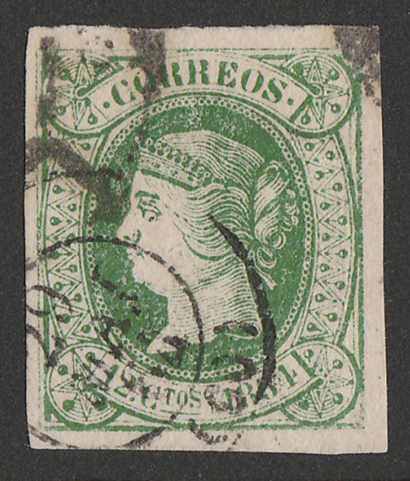 yellow-green, imperf, wmk diag mesh. VFU, barred oval pmk, 4 margins. Edifil 43 cat €120. SG 50 cat £275. Exp Scheller. (Image1)