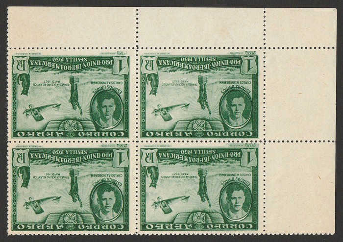Spanish-American Exhib 1P green, LL cnr marginal blk of 4, error head INVERTED. VF fresh MNH. SG 650(var), Ed 588ecei cat €480+. Spectacular inverted centre error. (P)