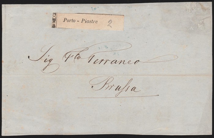 Admiralty Steamship Co 'Porto-Piastre' black label with '2' m/s rate on folded letter front to Brusa. Isfila YPO2. Very rare Local Post. 2020 Ceremuga photo cert . (P)