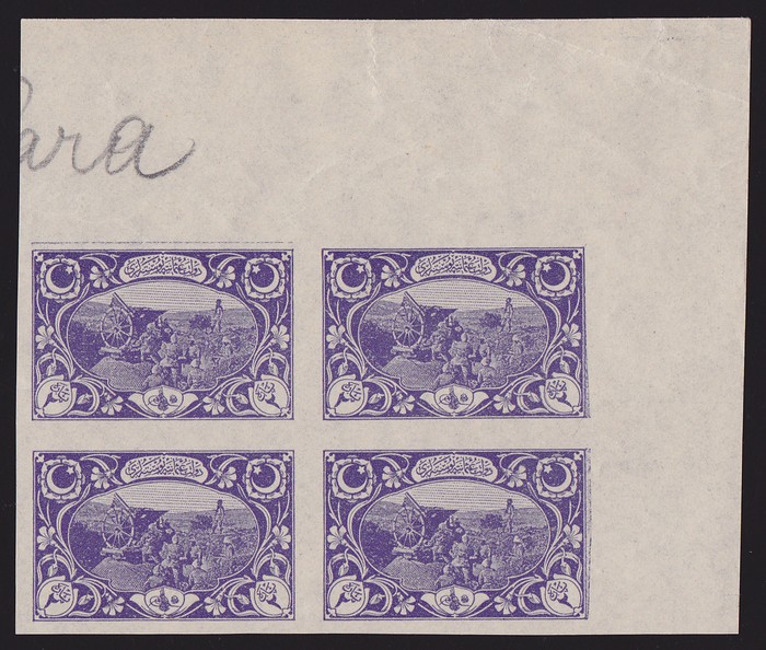 artillery 2pa violet, IMPERF UR cnr marg blk of 4. Superb fresh MNH, 4 large margins. SG 916(var), Mi 629(var). rare, only 1 sheet recorded. (4) (P) (Image1)