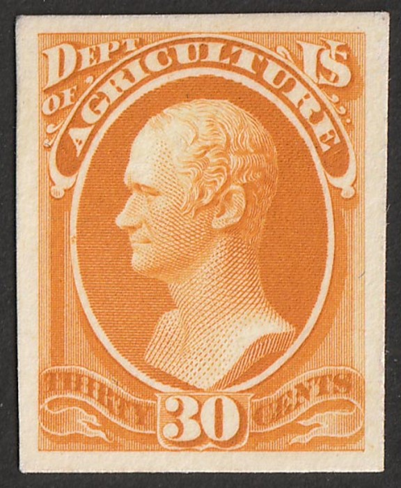 Agriculture 30c yellow plate proofs on card, imperf, in issued colour. VF UN as made, 4 margins. SG O188(p) cat £550 as normal. Sc O9PU cat US$10 (normal cat US$550).
