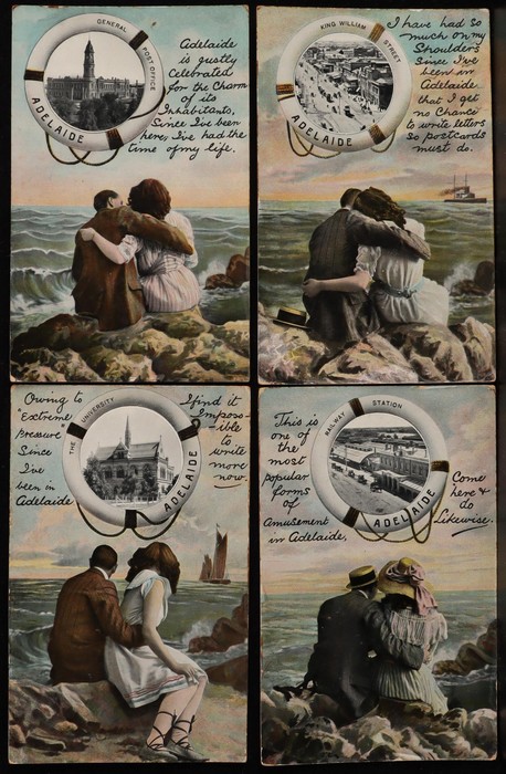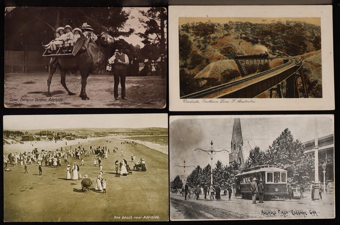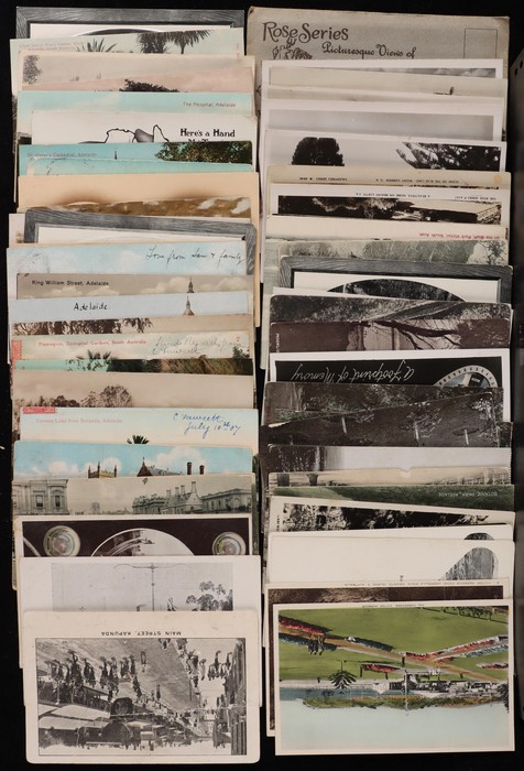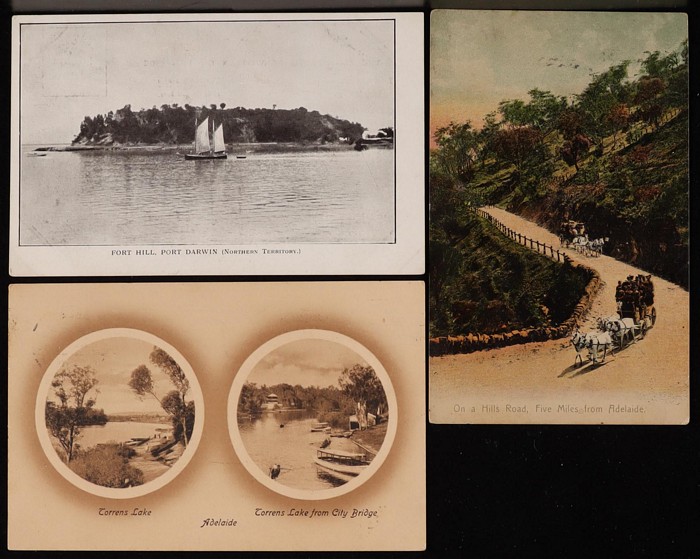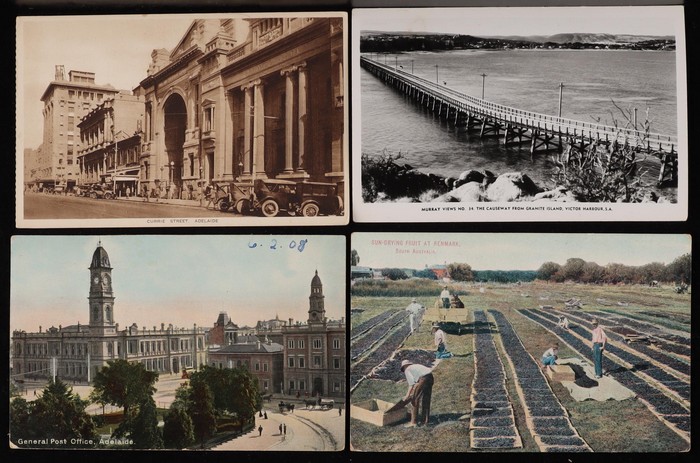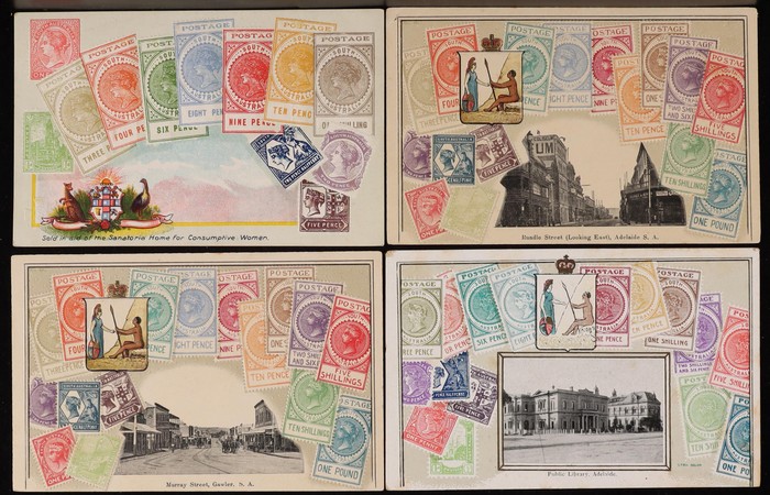 895 imageAustralia - South Australia collection inc Stamp Cards with photo vignettes (3), Stamp Card for Consumptive Home, National Memorial Unveiling, Railways, Coaching Scene, Electric Tram Opening, Adelaide Buildings & Street Scenes, Zoo Camel Rides, other areas inc Mt Gambier, Victor Harbour, Port Darwin. Mainly unused, some with SA stamps. 20+ colour. Mostly VG-VF. All diff. (72) (Image1) (Image2) (Image3) (Image4) (Image5)