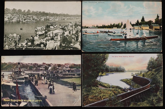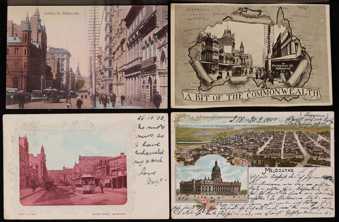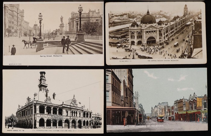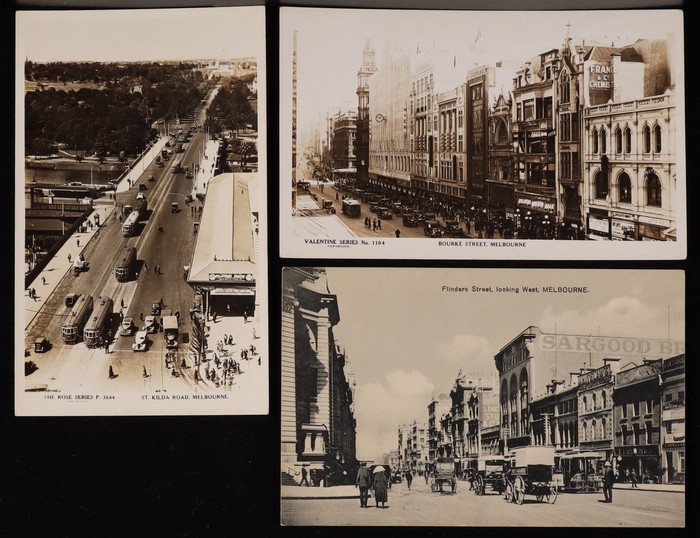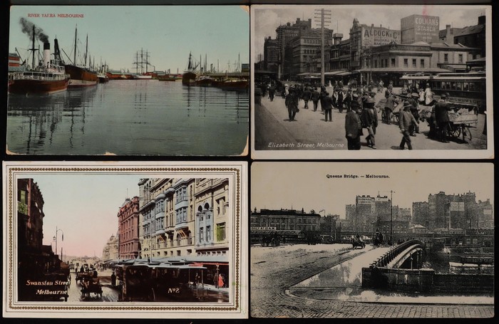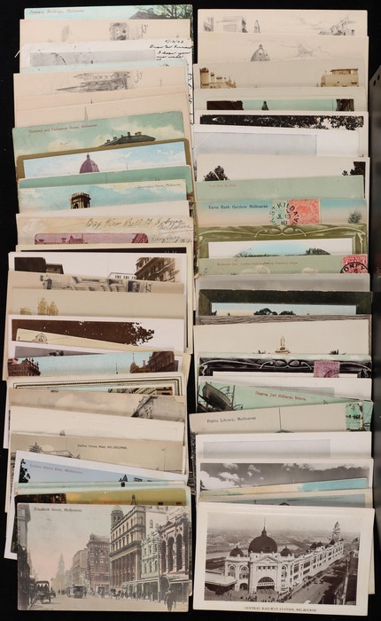 898 imageAustralia - Victoria -Melbourne collection of cards inc Panorama View Postally Used, later with many Animated Street Scenes, Public Buildings, Bridges, Port Scenes, Botanic Gardens. Some UB, some real photo types. About half unused, some with VIC & other State stamps, one with 1d Kangaroo, one with 1d violet & 1½d green KGV. 30+ colour. Mostly VG-VF. All diff. (79) (Image1) (Image2) (Image3) (Image4) (Image5)