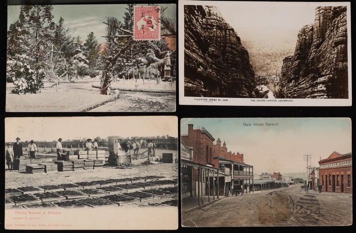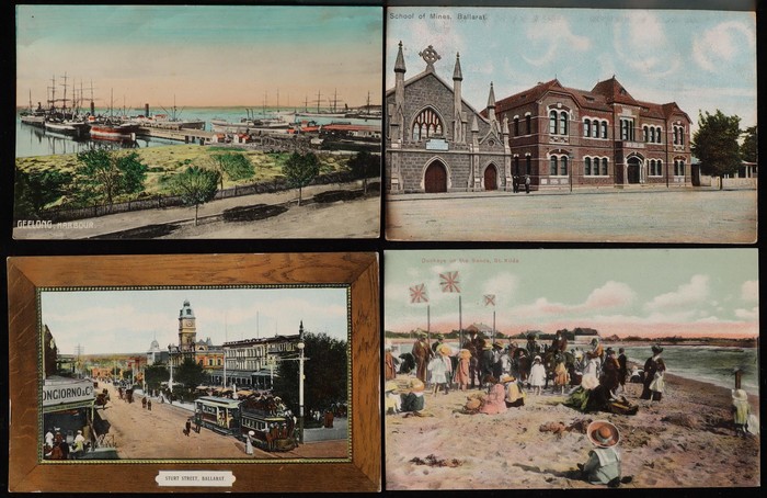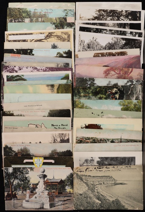 899 imageAustralia - Victoria collection inc a few Melbourne but mainly other areas inc Ballarat (12), Bendigo (3), Geelong (8), range of others inc Bairnsdale, Queenscliff, Stawell, Mt Eliza, Artist types by C Young (2), some later real photo types. Mainly unused, few with VIC stamps, one with 1d Kangaroo with Mia Mia pmk & another with 1½d red KGV. 15+ colour. Mostly VG-VF. All diff. (54) (Image1) (Image2) (Image3) (Image4)