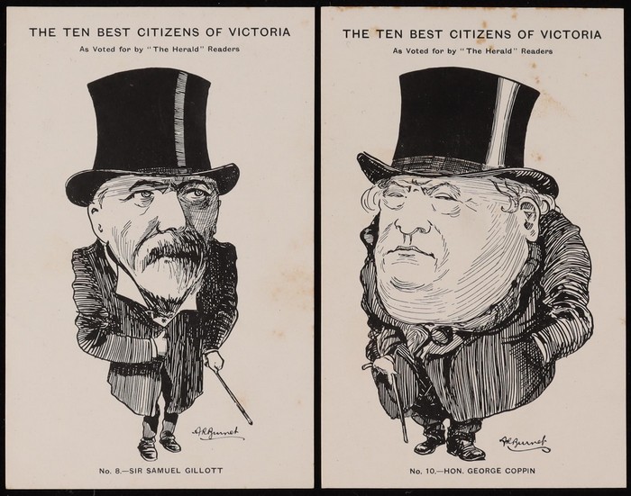 901 imageAustralian Artist: AR Buret 'The Ten Best Citizens of Victoria' group of 6 (numbered) inc Sir John Madden (No 1), Sir George Turner (No 4), Hon WH Irvine (No 7) & Hon George Coppin (No 10). Some minor foxing, F-VF condition. (6) (Image1) (Image2) (Image3)