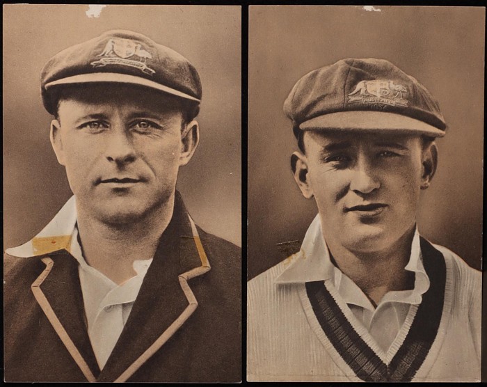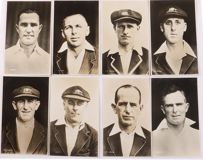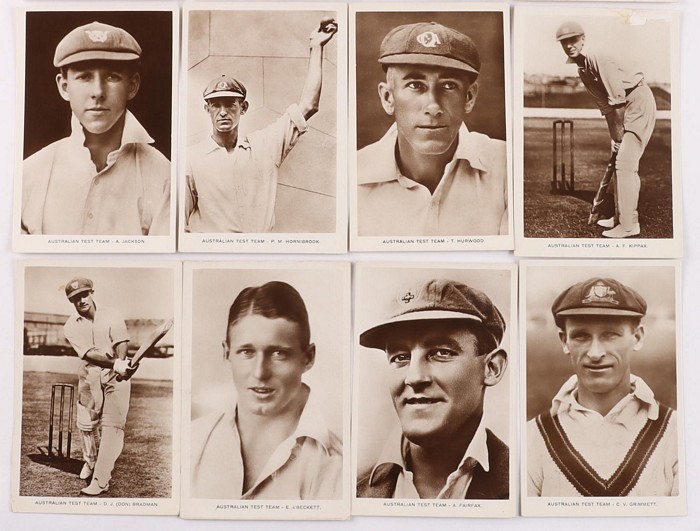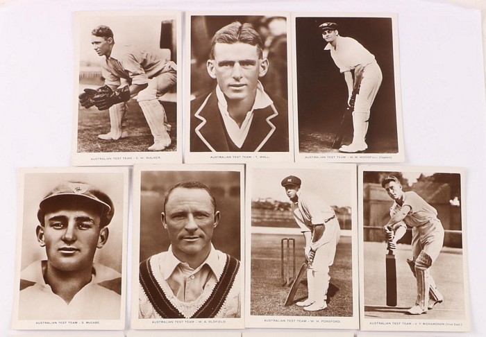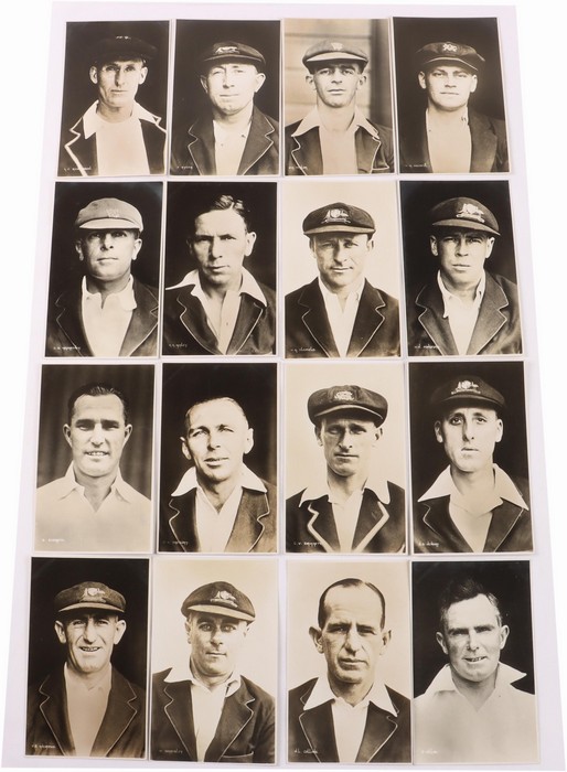 935 imageCricket: 1930 Australian Test Team set (?) of 15 real photos with DJ (Don) Bradman (Postally U July 1930), W A'Beckett, A Fairfax, CV Grimmett, A Jackson, PM Hornibrook, T Hurwood, AF Kippax, S McCabe, WA Oldfield, WH Ponsford, VY Richardson (Vice Capt), CW Walker, T Wall & WM Woodfull (Capt). Odd minor crease or sl bend, VF condition. Rare as a set. (15) (Image1) (Image2) (Image3)