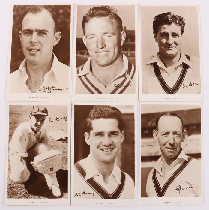 938 imageCricket: 1953 Australian 'Greetings from the 1953 Australian Team in England', 6 diff 'real photos' with ID Craig, RN Harvey, AL Hassett, WA Johnston, RR Lindwall & KR Miller. Superb fresh UN. (6) (Image1)