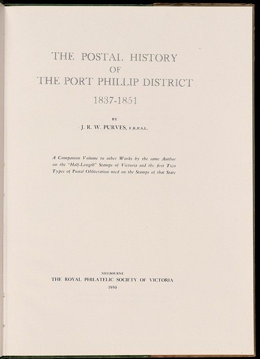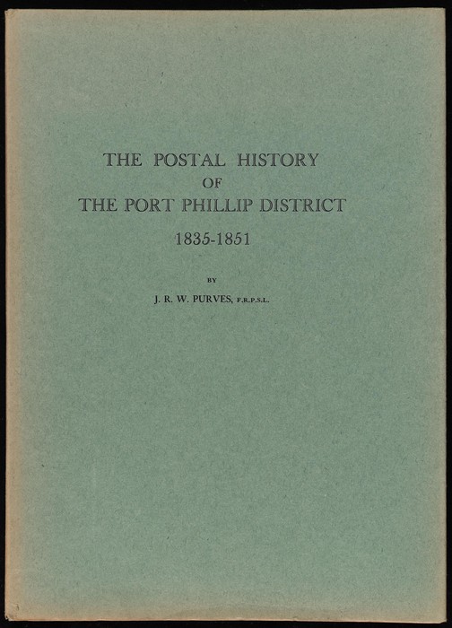 Postal History of the Port Phillip District 1935-51, by Purves, 68pgs, pub RPSV 1951 inc Post Office openings, name changes, postal markings & postal markings & rates. Near new condition inc VGC DJ. Long out of print. (Image1) (Image2)