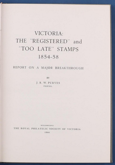Registered & Too Late Stamps 1854-58 by Purves, 80pgs, plus photo plate folder. Minor cover wear, mainly on cnrs o/w VGC, contents near new. (Image1) (Image2)