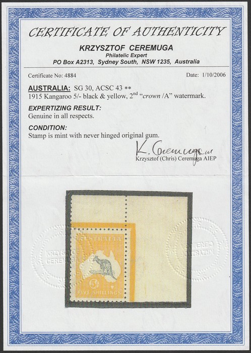 UR cnr marginal. Stamp VF MNH with never hinged original gum. SG 30. ACSC 43A cat $6500. Very rare genuine MNH. 2006 Ceremuga AIEP photo cert. (P) (Image1) (Image2)