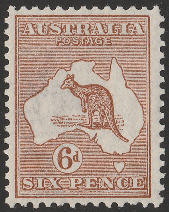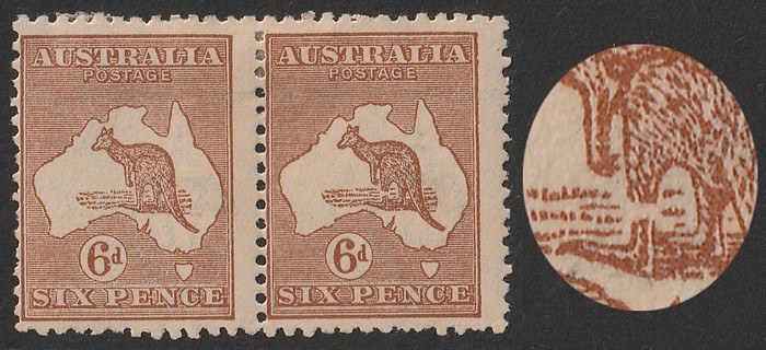 'Broken Leg on Kangaroo' (3L5-6) in pr. G-F M, sl darker gum. SG 73a cat £100 with additional stamp =A$200. ACSC 21A(3)d cat $290 with additional stamp. Wayward centring as usual. Ex Sandy. (2). (Image1)