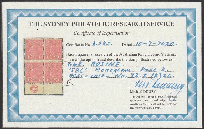 rough paper, perf OS. VF fresh MLH. SG O54c cat £140. ACSC 72Ibb cat $350. Copy of 2021 Drury photo cert for blk it came from. (P) (Image1) (Image2)