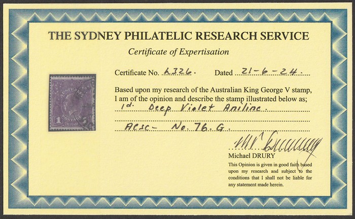 (aniline). FU, wayward centring. SG 57(var). ACSC 76G cat $375. 2008 Drury photo cert. (Image1)
