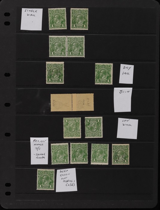 collection on hagners inc shades with a few deep green shades, noted pr with what appears to be a coil join, inverted wmks, dry ink. Major varieties inc a blk of 4 with 'dot before 1' (6/21), 'thin left frame' (6/22) (ACSC 71(3)na cat $250 M), blk of