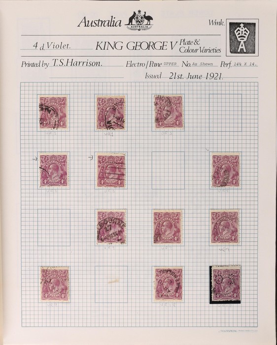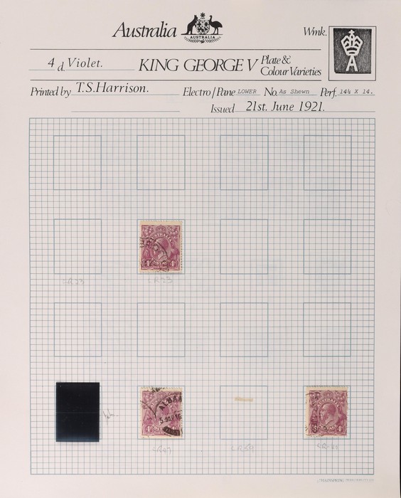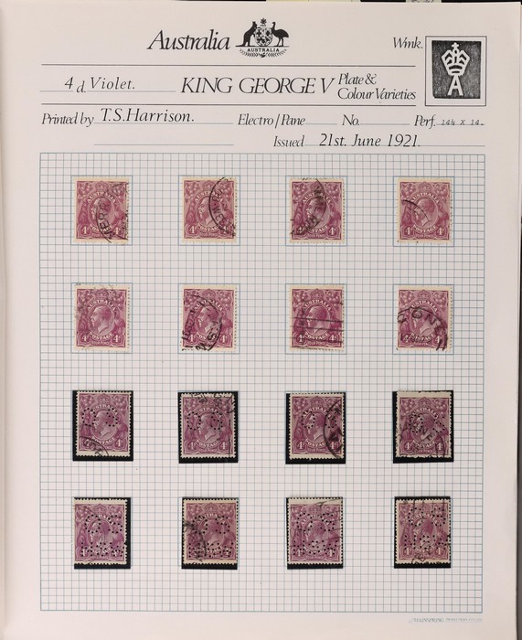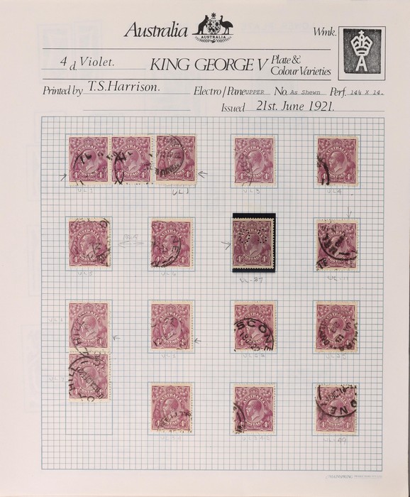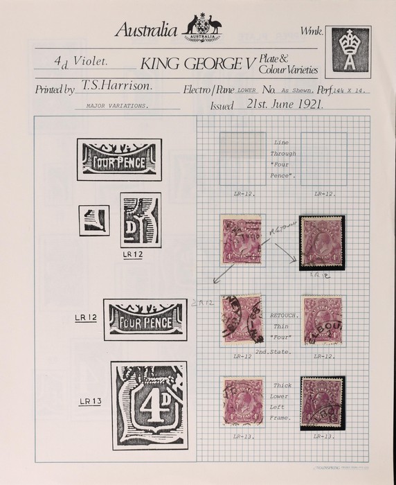 Collection on pages & hagners with shades, many major varieties (40+), inc 'cracked electro through kangaroo' (ACSC 111(1)e, 'thin four retouch' (ACSC 111(2)eb), 'retouch thin Four Pence' (ACSC 111(2)ra - 4 examples), various minor varieties. G-VFU,