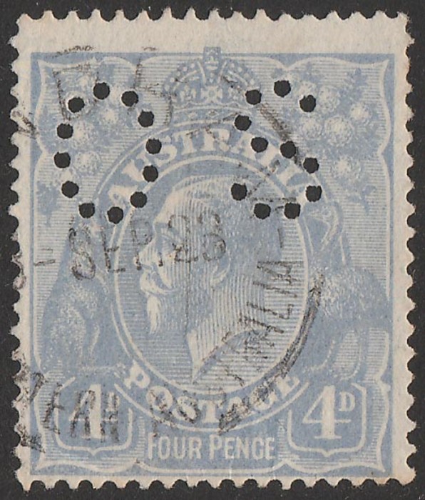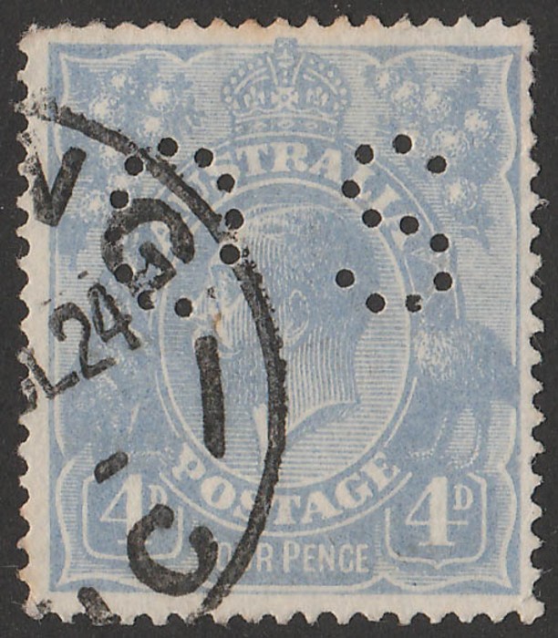 OS with variety 'horned emu, State 1' (2R17). FU with part Geelong 28 SE 23 cds. SG O74(var), ACSC 112A(2)t cat $90, plus 75% premium for perf OS is $157. (Image1)