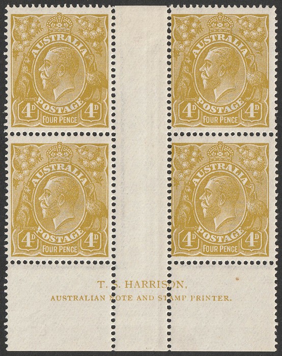Harrison printing wmk INVERTED blk of 4. F-VF MLH, sl perf separation. SG 65w cat £360+. ACSC 113aa cat $900+. Multiples quite scarce. Ex Sandy. (4). (P) (Image1)