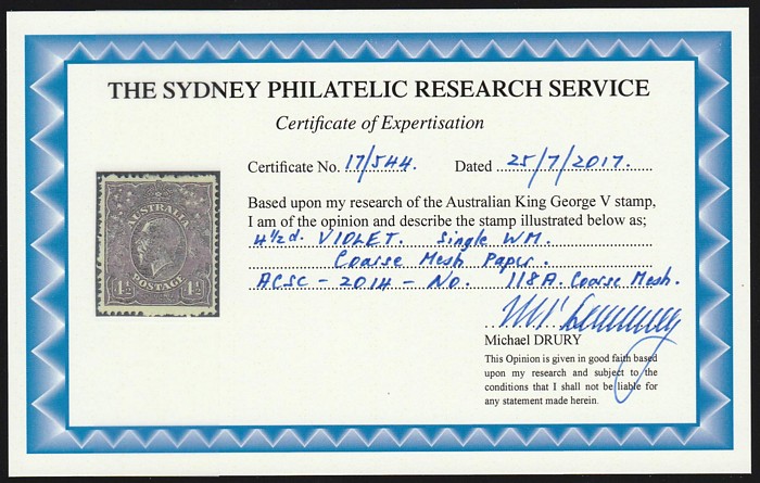 violet on coarse mesh paper with typical fluffy perfs. Lightly cancelled FU. SG 81(var), ACSC 118Cab. 2020 Drury photo cert. (P) (Image1) (Image2)