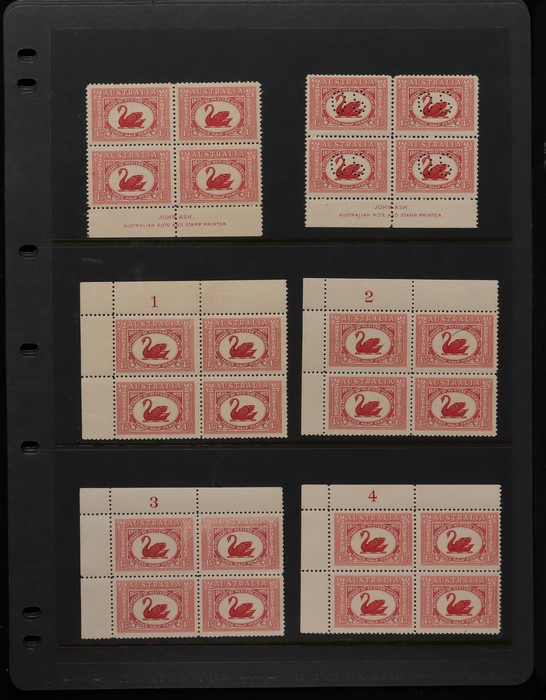 WA 1½d Swan UL cnr plate number blks of 4 1-4 & 6-1. F-VF M/MNH. Also imprint blks of 4 (2) inc OS Perfin (as is). Attractive. ACSC cat $300, plus the OS perfin cat $525. (11 blks) (Image1) (Image2)