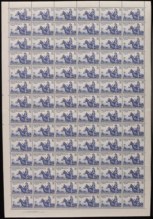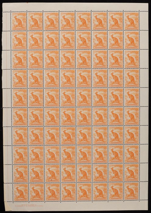 sheet of 84 with perf-pips at left & Authority imprint al LL cnr. A couple of rev spots o/w F-VF MNH. ACSC b z cat $220. (84) (Image1)