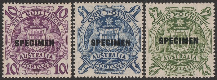 £1, £2 opt SPECIMEN. 10/- w/c MLH, £1 MNH & £2 VFM. SG 224bs-ds cat £170. ACSC cat $250. (Image1)