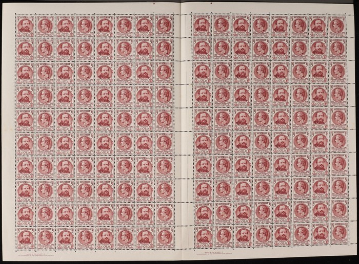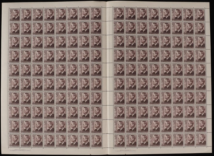 Stamp Centenary 2½d pr, sheet of 160 (butterfly folds) with comp perf-pips at base & both Authority imprints. Minor adhesion to central gutter o/w fresh MNH. ACSC 278, 279 ba zf cat $350. (160) (Image1)
