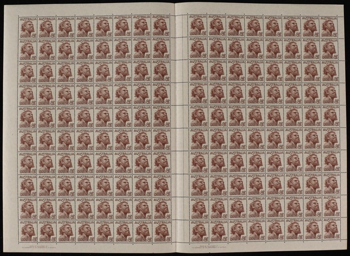 Barton/Parkes se-tenant pr sheet of 160 with 2 perf pips at top & both Authority imprints. Cpl small spots in gutter o/w VF MNH. ACSC 280/81 ba zc zd cat $375. (Image1)
