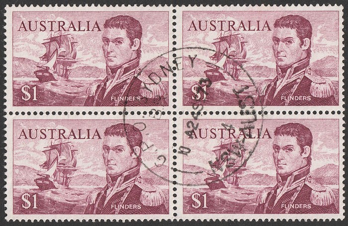 Flinders perf 14.78 x 14.10, blk of 4 cancelled GPO Sydney 24 SEP 37 cds. The ACSC notes that 'earliest pmk dates are in September'. Because this has a CTO cds it could be an earliest recorded date. VFU. SG 401c cat £60 = A$120. ACSC 464B cat