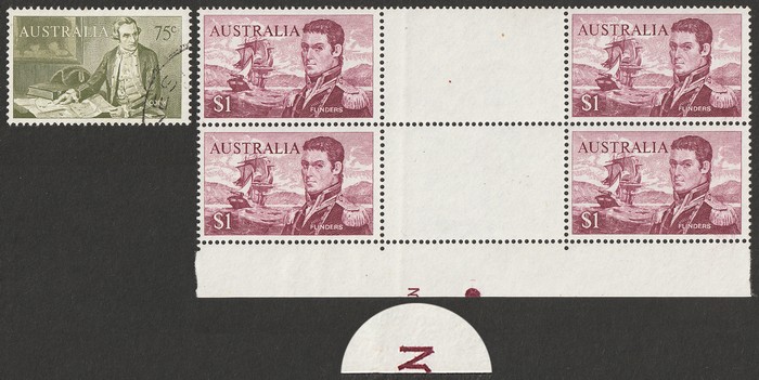 Flinders perf 15x14, large part plate number 3 lower marginal gutter blk of 4. Fresh MNH. SG 400c cat £340 = A$650 as 4 individual stamps. ACSC 464 za cat $500. (P)