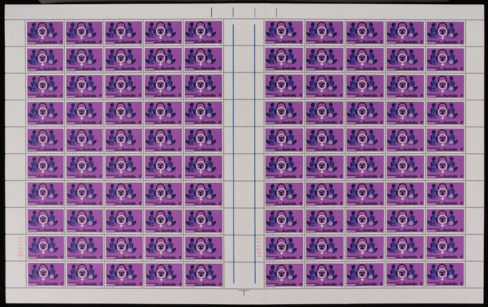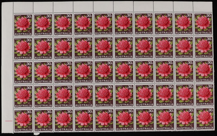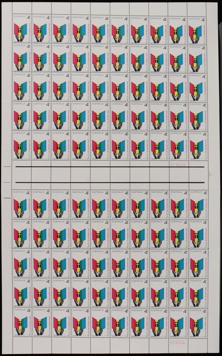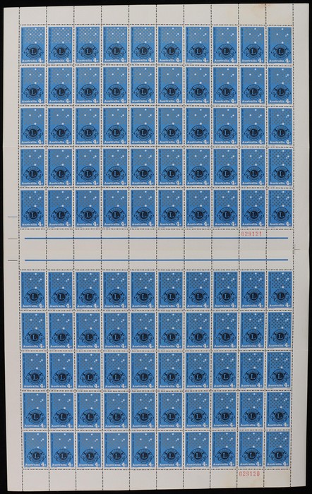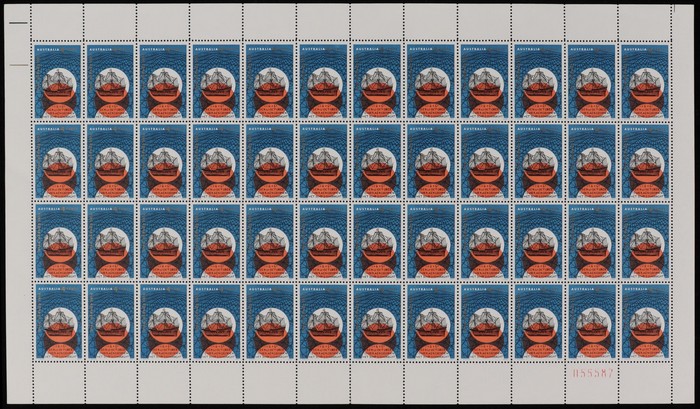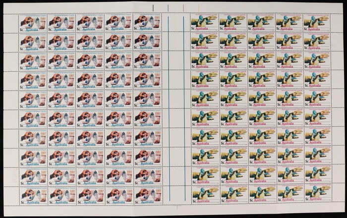 sheet of 48 with blue, black Autotrons at UR cnr, red sheet number at LL & varieties 'retouch under TR of AUSTRALIA' (pos 7/2) & 'retouch over AL of Royal' (pos 10/1). Fresh MNH. ACSC 470 d e z zc cat $60. (48) (Image1)