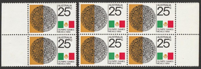 uncoated paper (orange-brown UV reaction) right marginal blk of 4 with normal surfaced paper pr for comparison. Fresh MNH. SG 429(var). ACSC 492aa cat $50 ea, $200. (6).