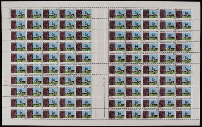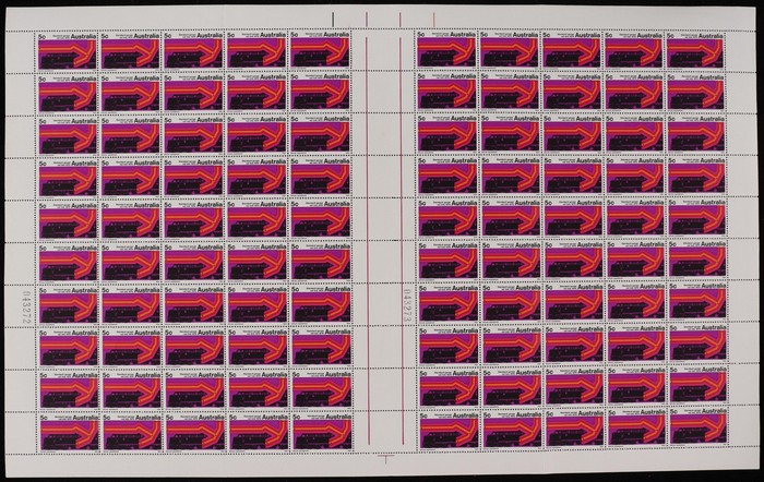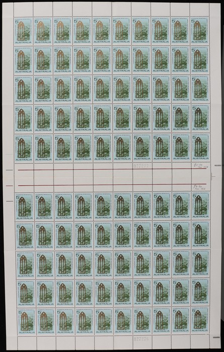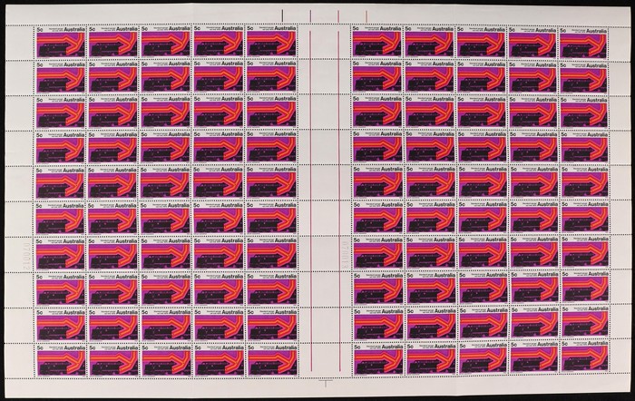 Territory 5c light ochre sheet of 100 with Autotrons at top & both black sheet numbers. Gum adhesions to upper & lower right cnrs. F-VF MNH. SG 437(var). ACSC 500B z za zb cat $230. (Image1)
