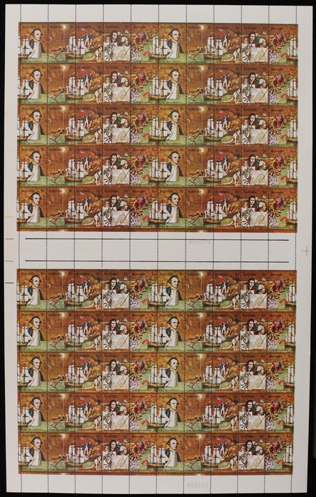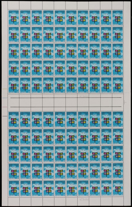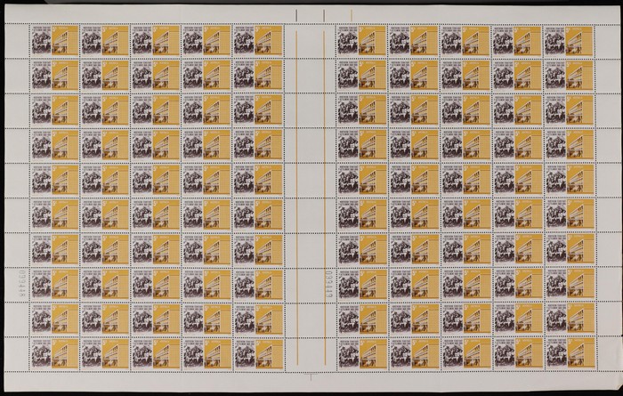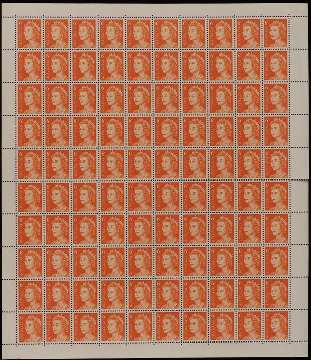 right pane of 50 inc part gutter strip at left inc gold & green Autotrons at UL cnr, black sheet number at LL & variety 'retouch between heads at LL' (pos RP10/1). Fresh MNH. ACSC 547 d zb cat $86. (50) (Image1)