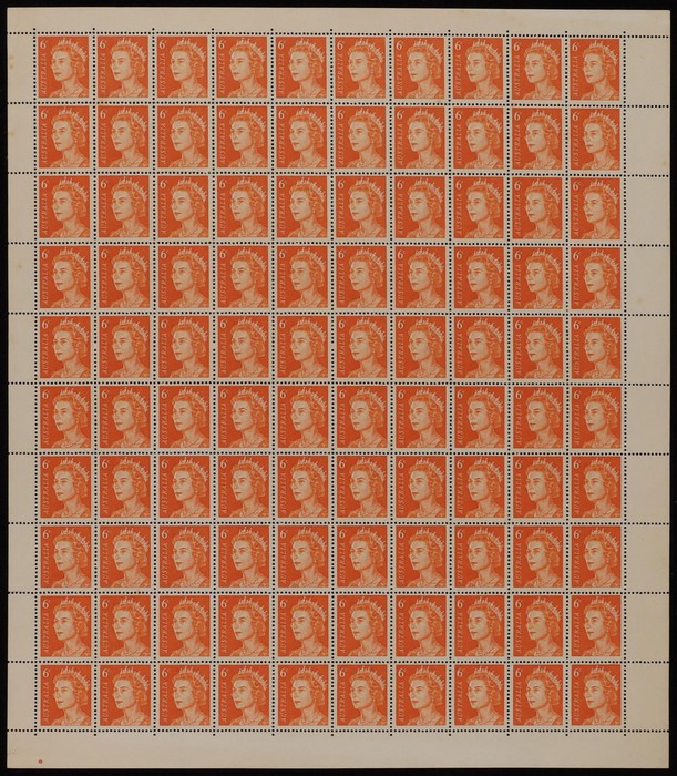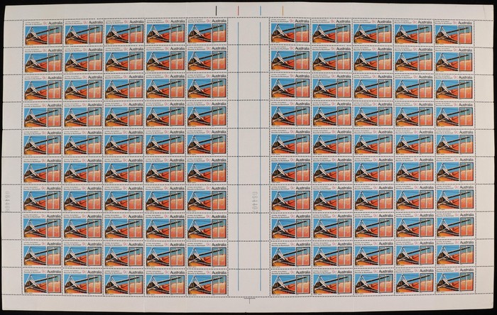 sheet of 100 with Autotrons at top, both black sheet numbers & variety 'white spot in root near IA of AUSTRALIA' (pos R 7/15). Some central horiz perf separations. Fresh MNH. ACSC 521 d z za zb cat $67. (100) (Image1)