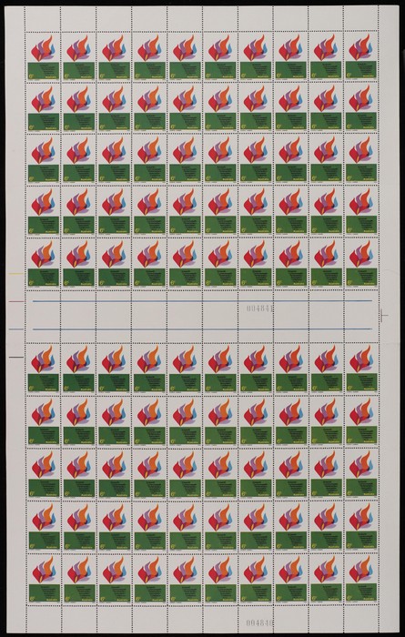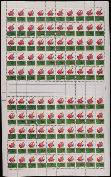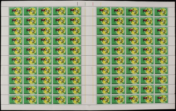 sheet of 100 from the first printing with grey sheet numbers under Pos 5/7 & grey bars at LR cnrs plus ACSC listed variety 'hole in tree at LL cnr' (Pos LP 2/9) & Autotrons at left. Around 10 stamps with hard to see tropicalisation, F-VF MNH. ACSC