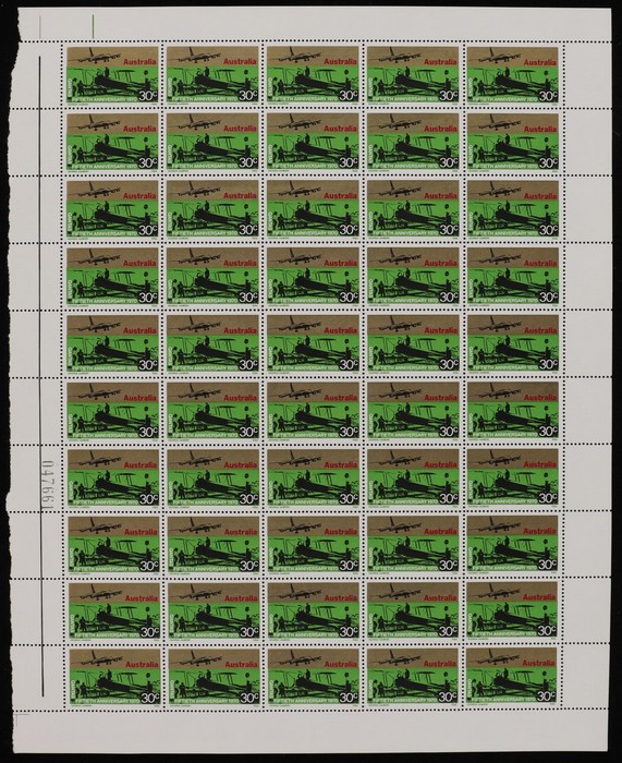 Development 9c Bauxite sheet of 100 with Autotrons at top, both black sheet numbers & ACSC listed varieties 'retouch under AU of Australia' (Pos L5/3), 'retouch in blue below cables' (L6/2), 'retouch adjoining frame at left' (R3/3) & 'retouch in blue