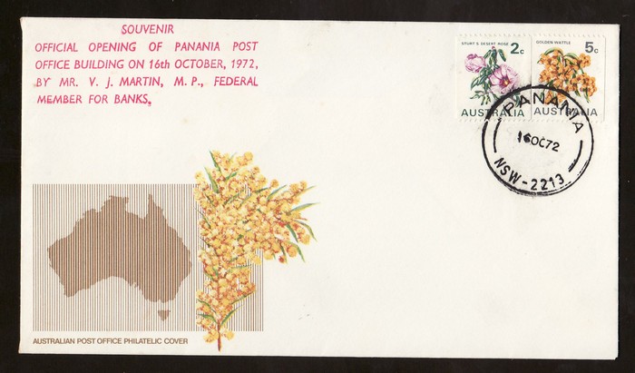 Opening Panania Post Office cachet in red on Wattle PO pictorial envelope with 1970 coils 2c, 5c boldly cancelled by 'Panania NSW' cds. Fine. A scarce envelope. Almeida RS3 cat $200 (1997) (Image1)