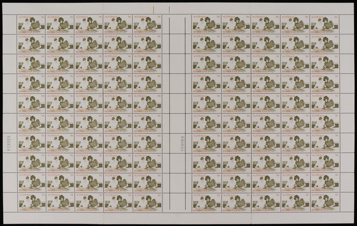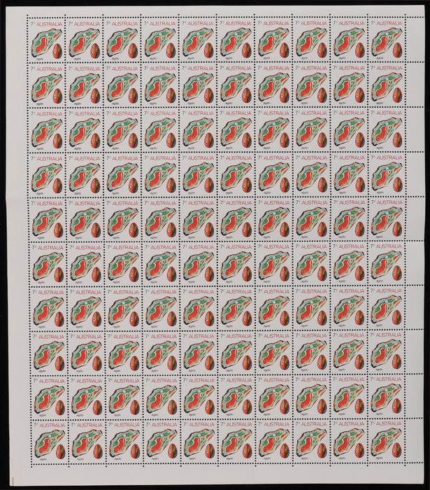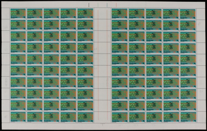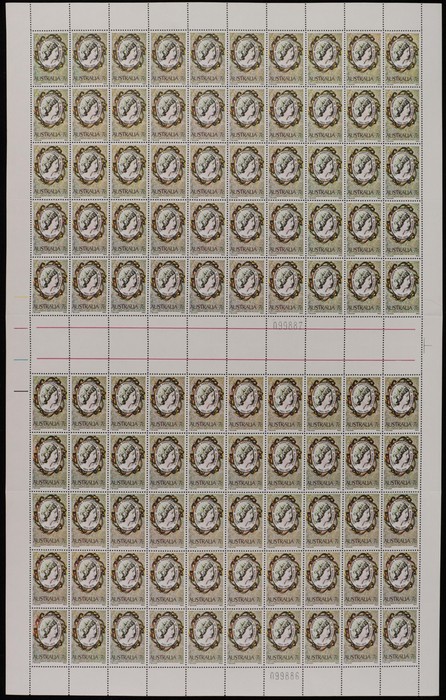 sheet of 100 with Autotrons at top, both sheet numbers & ACSC listed varieties 'retouch under RALIA' (Pos LP 9/5) & 'weak screen/retouches right of 7c' (RP 1, 2, 3/5). Fresh MNH. ACSC 600 d e (both) f z za zb cat $135. (Image1)