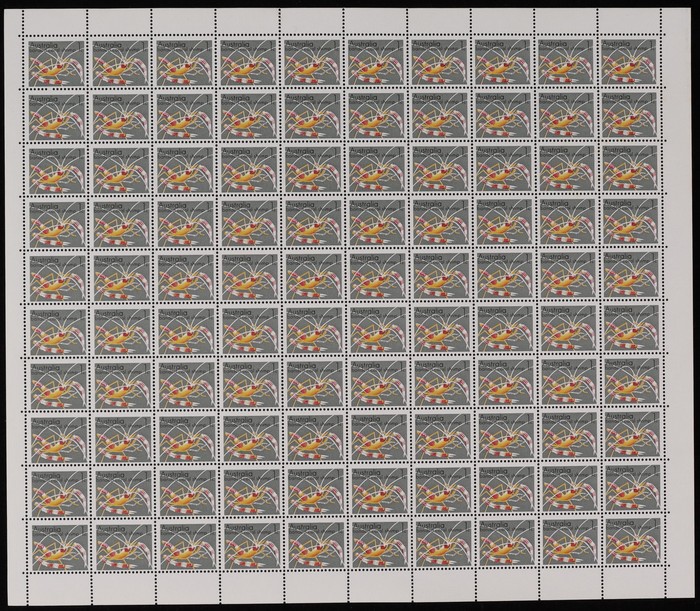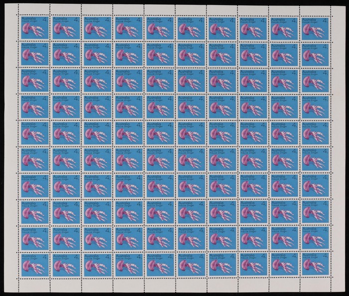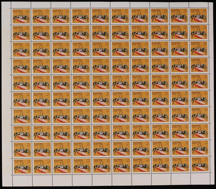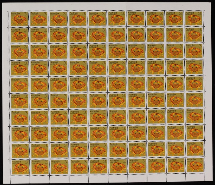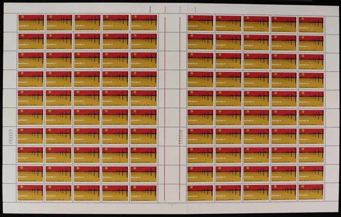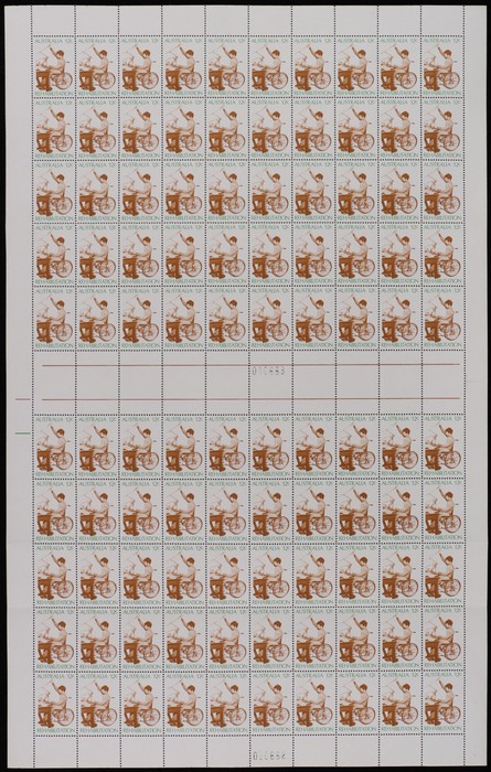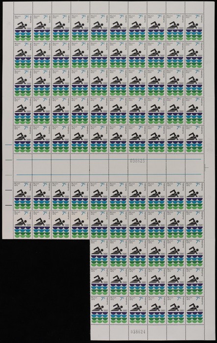 Swimming near comp sheet of 92/100 (missing LL cnr) with Autotrons at left, both sheet numbers & ACSC listed varieties 'retouches in black' (Swimmer, Pos UP1/2) & 'retouches to head' (UP5/7). ACSC 603 d e f z za zb cat $70. (Image1)