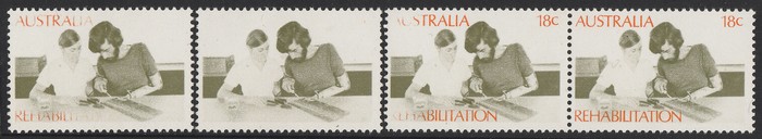 Rehabilitation 18c, error 'orange OMITTED' in a reconstructed horiz strip of 4, showing orange omitted on right portion of 1st stamp (so only partial inscriptions & no denomination), orange totally omitted on 2nd stamp (so no inscriptions & no