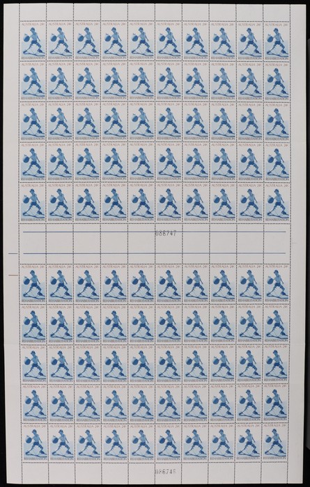 24c Youth on white paper sheet of 100 with Autotrons at left, both sheet numbers under stamp 5 & all 4 ACSC listed varieties inc 'retouch over RE of Rehabilitation' (Pos UP3/8) & 'diagonal white line on ball retouched' (Pos LP3/9). VF MNH. ACSC 599