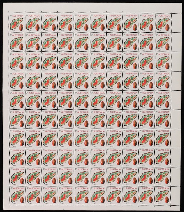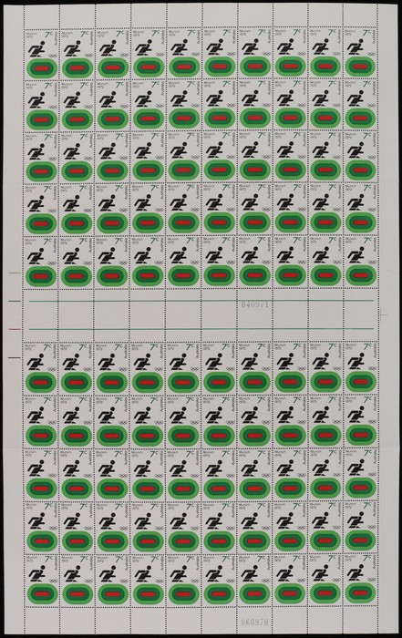 sheet of 100 with Autotrons at left, both sheet numbers & ACSC listed varieties 'weak base on 2 of 1972' (Pos UP2/2), 'retouches in green racetrack' (UP5/3), 'retouch in lower racetrack' (LP4/7) & 'retouch at right of green oval' (LP5/3). Fresh MNH.