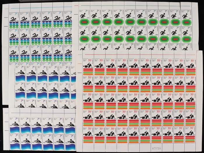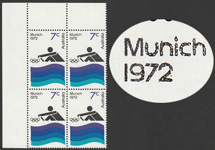 Rowing UL cnr blk of 4 with varieties 'retouch to Munich 1972' (pos UP1/2) & 'retouch to tral of Australia' (pos UP 2/1). F MNH. ACSC 602d/f cat $700. (P) (Image1) (Image2)