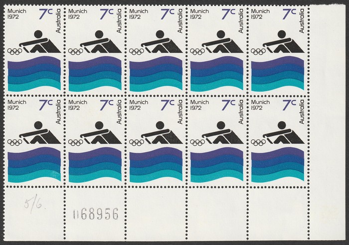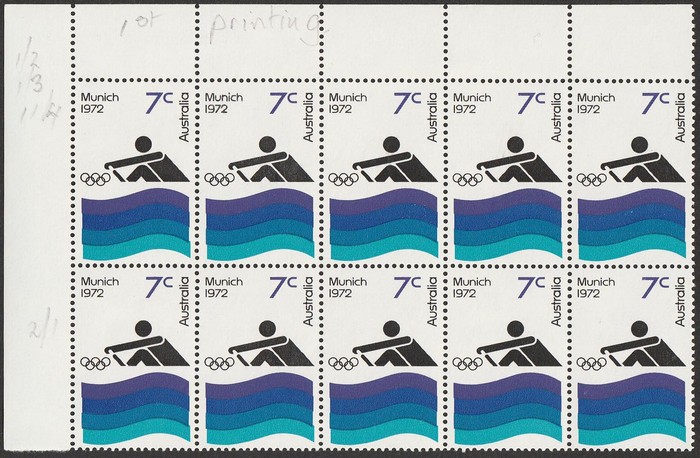 Rowing UL cnr blk of 10 with ACSC listed varieties 'retouch to Munich 1972' (Pos 1/2), 'circular white ring in dark blue band' (Pos 1/3) & 'retouch to TRAL of Australia' (Pos 2/1). Fresh MNH. SG 519 var. ACSC 602 d e f cat $700+. (Image1)